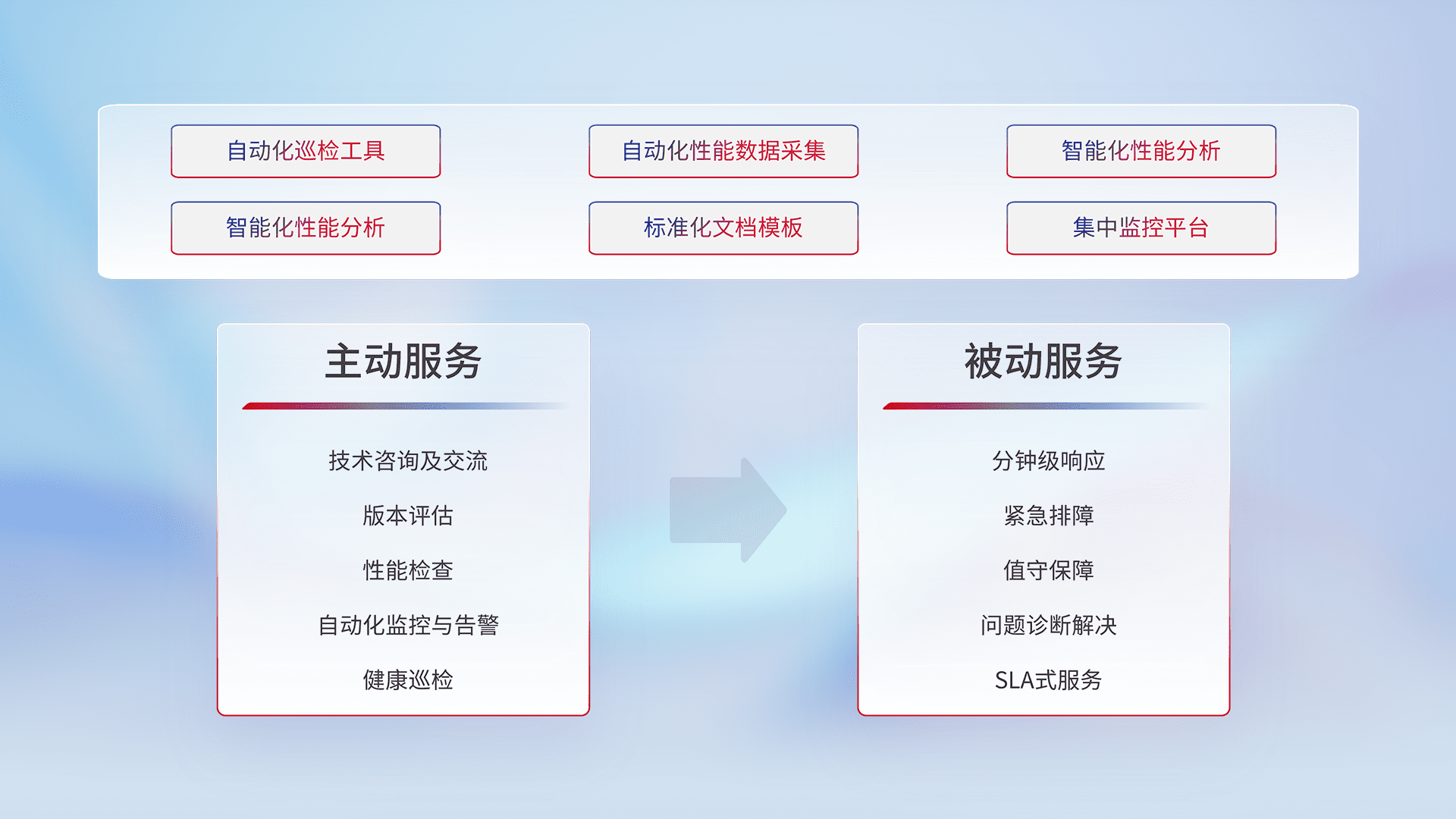 智能化工具和标准化文档,,保障服务质量,,,,提供主动服务(包含技术咨询、、、、版本评估、、性能检查、、、、自动化监控与告警、、健康巡检)和被动服务包含(分钟级响应、、、、紧急排障、、、值守保障、、问题诊断解决、、SLA服务)。。。。